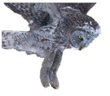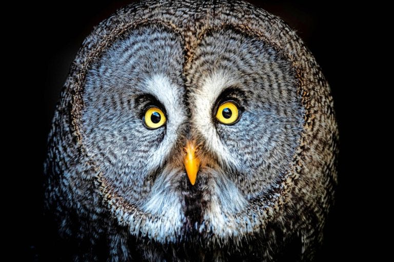 My favorite listener of all time (FLOAT) is a predator, the magnificent great grey owl (Strix nebulosa), whose gorgeous fifty-shades-of-grey plumage serves as a soundproofing puffer coat over a surprisingly diminutive body, making the creature both the world’s largest owl in length and one of its lightest in weight.